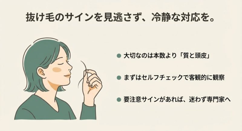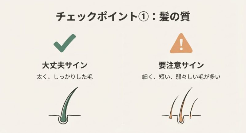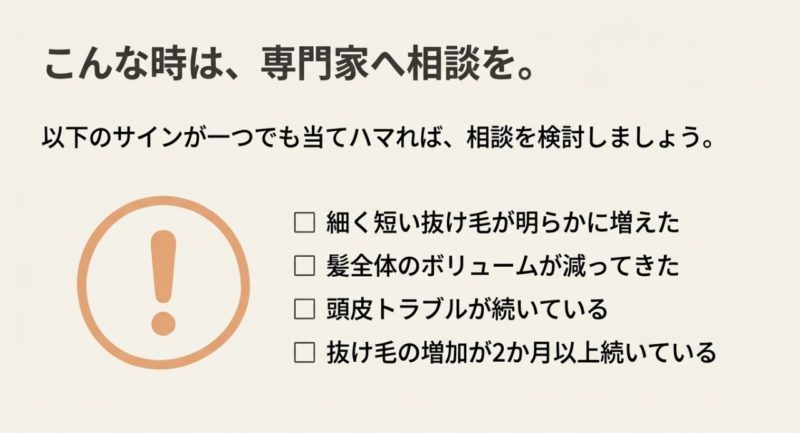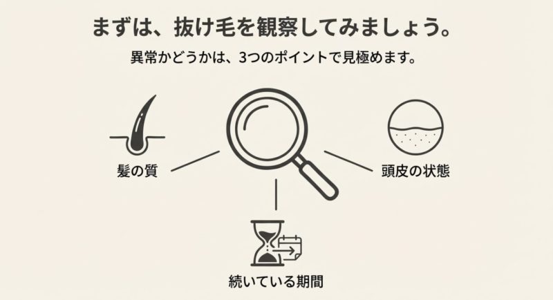 次に、増え方が続くか、短く細い毛が混じるか、頭皮トラブルがあるか、分け目や生え際の変化があるかをセットで判断していきましょう。 本数だけだと情報が足りないので、ここを補うイメージです。