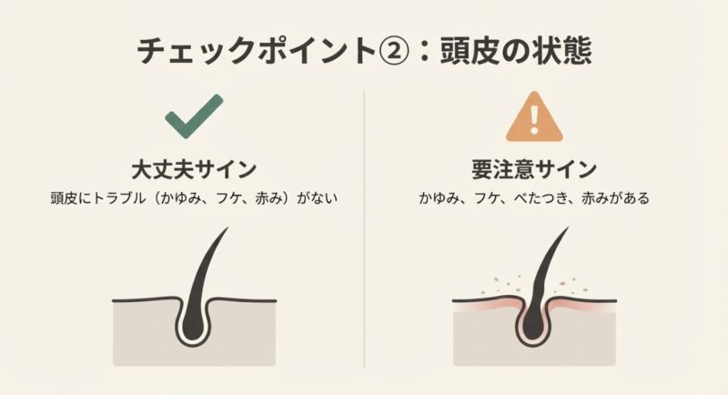 - 頭皮の異常:かゆみ・赤み・フケ・ベタつき・臭い