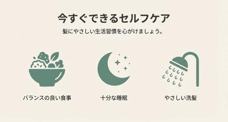 そして、やることはシンプルで、まずは正しい洗髪、睡眠と食事の立て直し、頭皮トラブルのケア。 そこで改善しない、またはAGAやFAGAが疑わしいなら、医療機関に相談するのが現実的です。 ここを「負け」みたいに感じる人もいるけど、私はむしろ賢い選択だと思います。 悩みが長引くほどストレスで悪循環になりやすいので。