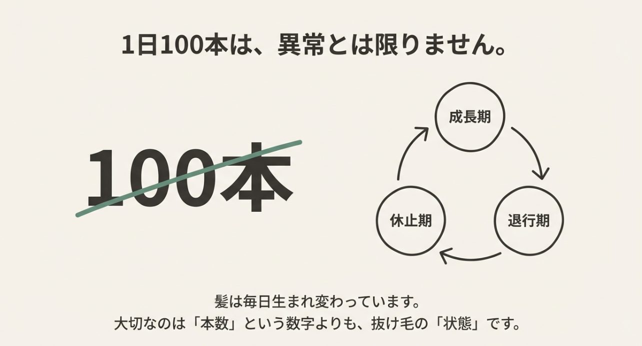 まずは「排水溝で100本」という見え方が、必ずしも異常とは限らない点を押さえます。 大事なのは、1日の総量、増え方、抜け毛の質(太さ・長さ・毛根の状態)をセットで判断することです。