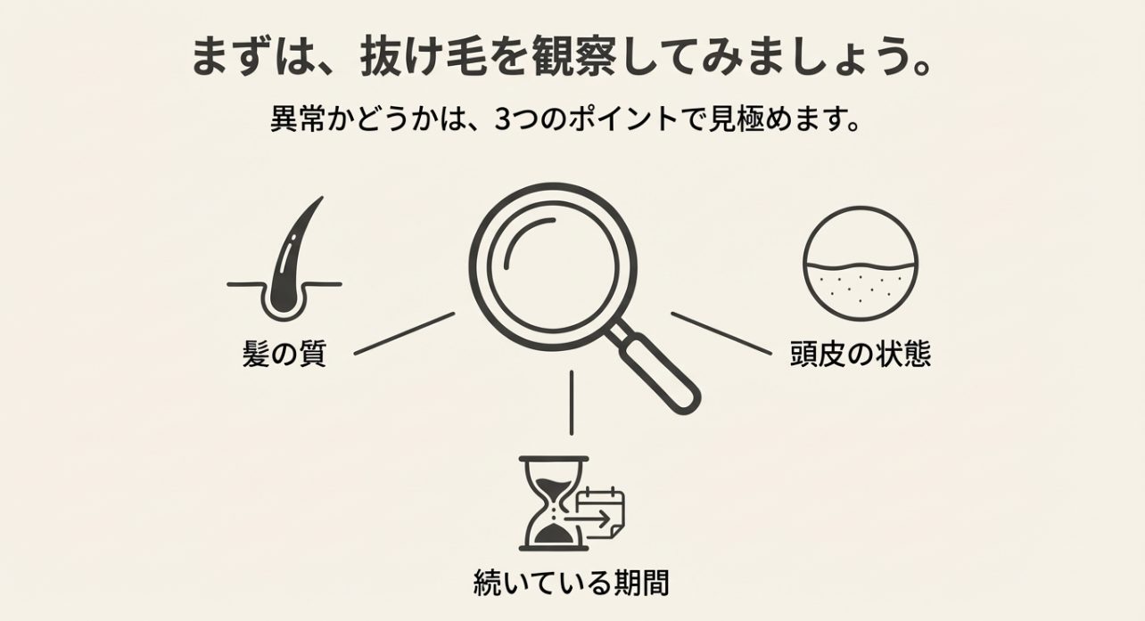 私は、抜け毛の悩みを整理するときに、まずこの3つから見ます。 ここ、気になりますよね。