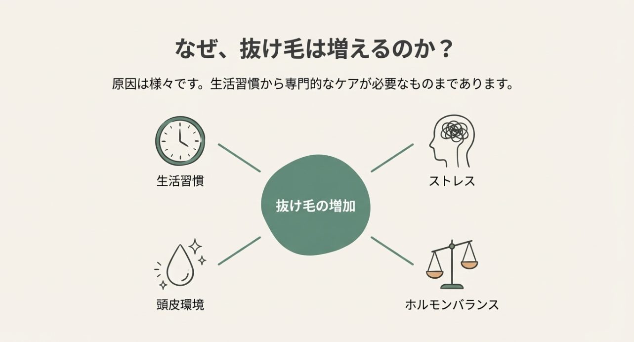 抜け毛が増える原因はひとつじゃなく、重なって起きることが多いです。 たとえば、睡眠不足とストレスで自律神経が乱れ、食事が偏って鉄分やたんぱく質が不足し、さらに頭皮が乾燥や皮脂過多で荒れる…みたいに、連鎖します。 だからこそ、「これだけやれば絶対OK」みたいな単発の解決策より、原因をほどいて優先順位をつけるのが近道なんですよ。