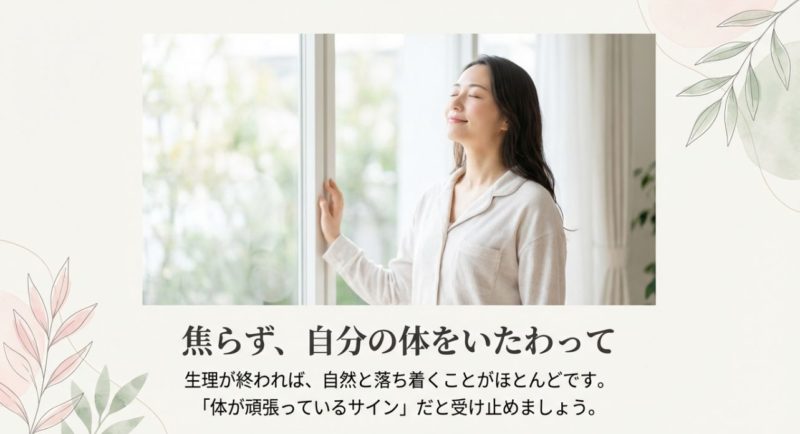 こちらも目安ですが、生理が始まってホルモンの波が切り替わると、落ち着いていく人が多いです。 体感としては、生理開始後〜1〜2週間くらいで「いつもの量に戻った」と感じるケースがよくあります。 ただ、これは“平均的にそう言われやすい”という話で、個人差がかなり大きいです。