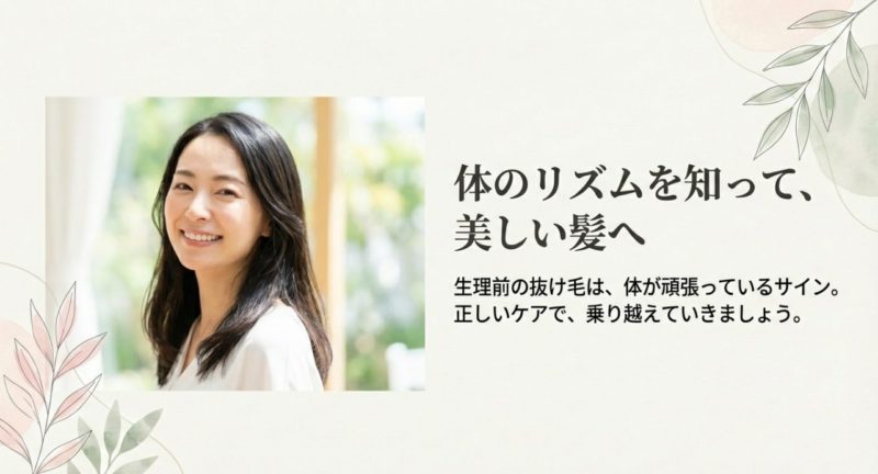 最後に大事なことをひとつ。 生理前の不調って、どうしても「気合いでなんとか」しがちですが、髪はそういう無茶が結果に出やすいです。 生理前は“守りの期間”と割り切って、刺激を減らすだけでも、抜け毛の体感がラクになる人は多いですよ。