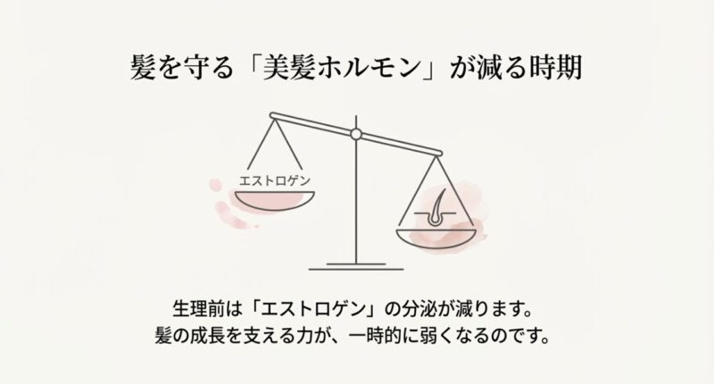 生理前の抜け毛は、気のせいではなく体のリズムに沿って起こりやすい現象です。 特に女性ホルモンの波が、髪の成長サイクルと頭皮環境に影響します。 ここでは「なぜ増えるのか」を、なるべく分かりやすくほどいていきます。