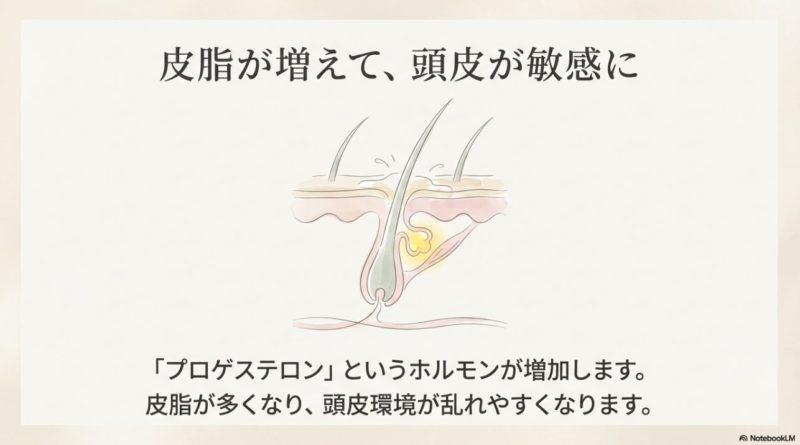 生理前はプロゲステロンが優位になりやすく、頭皮の皮脂が増えやすい人がいます。 すると、ベタつき、におい、かゆみ、フケっぽさなど、頭皮トラブルが出やすくなることも。 ここ、地味にストレスですよね。髪がベタつくと「抜け毛が増える気がする」って不安も増幅しやすいです。