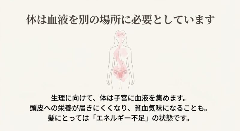 | PMSによる睡眠や気分の揺れ | 血流・回復力が落ちやすい | 抜け毛の長期化につながることも |
