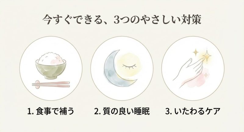 対策は「ホルモンの波を止める」よりも、波が来ても崩れにくい土台を作るイメージが現実的です。 栄養・睡眠・頭皮ケア・受診判断をセットで整えると、手応えが出やすいですよ。