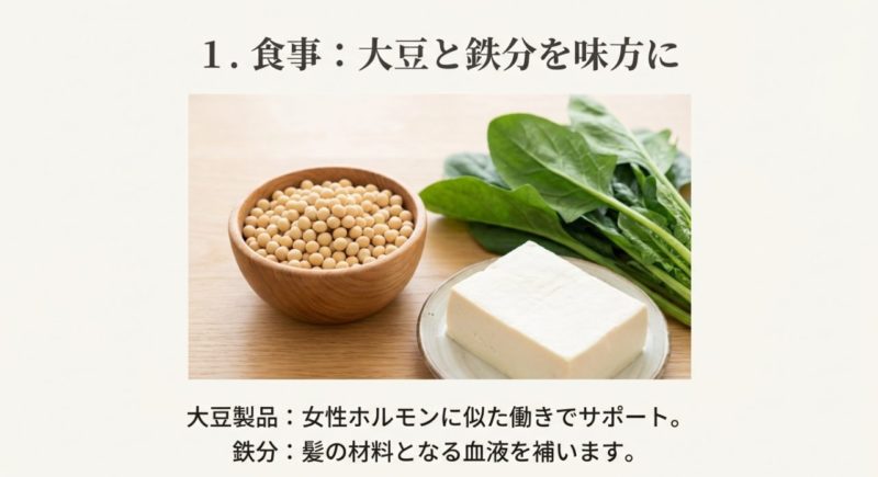 ポイント:まずは食事で「鉄+たんぱく質」をセットで意識すると、髪の材料が揃いやすいです。