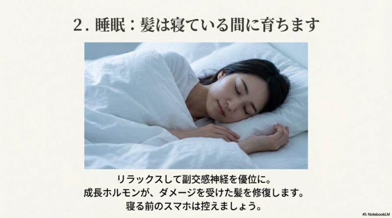 ストレスが強いと交感神経が優位になりやすく、末端の血管がキュッと収縮しがちです。 頭皮の毛細血管は細いので、この影響が出やすい。 さらに睡眠が崩れると、髪の修復に関わるホルモンの分泌リズムも乱れやすいです。 ここが重なると、抜け毛が生理前に増えるだけじゃなく、戻りが遅くなることがあります。