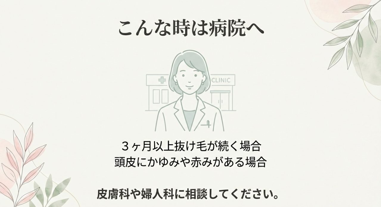 もし抜け毛が生理前の一時的な範囲を超えている感じがするなら、自己判断で抱え込まず、皮膚科や婦人科で早めに相談してください。 正確な情報は公式サイトをご確認ください。 最終的な判断は専門家にご相談ください。