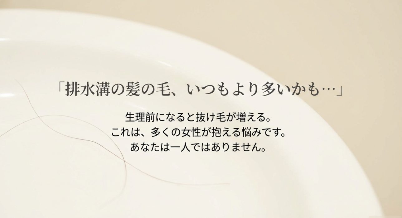 もし生理周期に合わせて毎回同じように増減するなら、まずはこのホルモンの波がベースにある可能性が高いかなと思います。 逆に、周期と無関係に増え続ける、部分的に薄くなる、という場合は別の要因(頭皮炎症、甲状腺、女性男性型脱毛症など)も視野に入れた方が安心です。