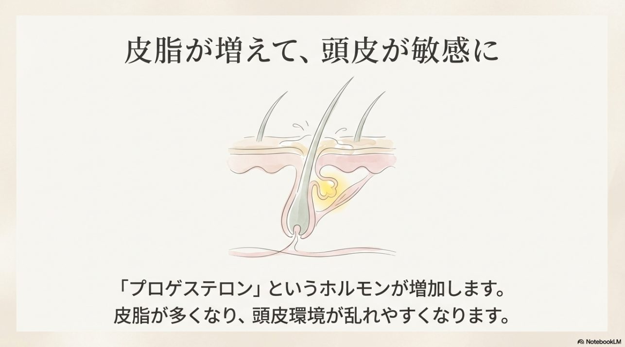 生理前はプロゲステロンが優位になりやすく、頭皮の皮脂が増えやすい人がいます。 すると、ベタつき、におい、かゆみ、フケっぽさなど、頭皮トラブルが出やすくなることも。 ここ、地味にストレスですよね。髪がベタつくと「抜け毛が増える気がする」って不安も増幅しやすいです。