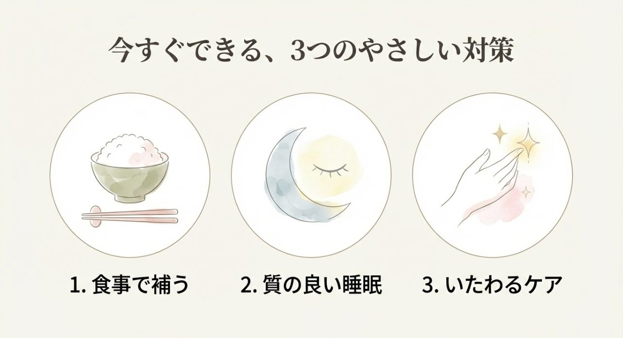 そして、ここで注意したいのが“対策の方向性”。 エストロゲンを自力で無理やり増やそうとするより、波があっても髪が落ちにくい土台を作る方が現実的です。 具体的には、頭皮の炎症を起こさない、栄養不足を放置しない、睡眠で回復を確保する、の3点が効きます。 ホルモンは自分で操作しにくいけど、生活は操作できるんですよ。
