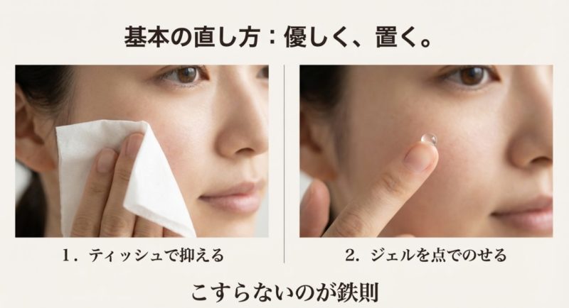 化粧直しの前に、まずティッシュで皮脂と汗を軽く押さえます。 ここでゴシゴシすると、ファンデが余計に剥がれてムラになるので、あくまで「押して回収」です。 次に、ジェルを指先に取り、乾燥が気になる部分に点で置きます。 最後にタッピングかハンドプレスで密着。 伸ばし切ろうとしないのがポイントです。 伸ばすほど摩擦が増えて、ヨレやモロモロの原因にもなるので、外出先では特に「触る回数を減らす」と安定します。