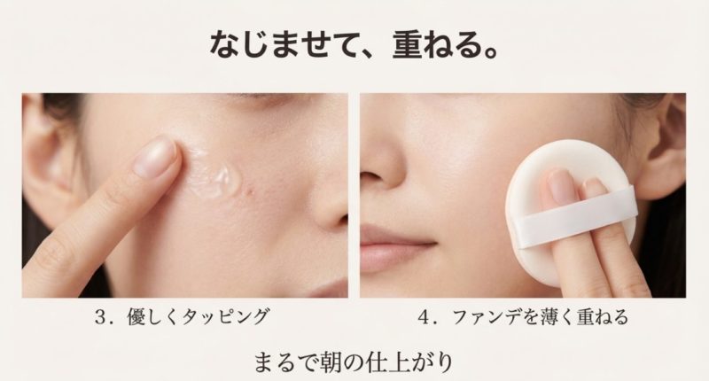 | 冬 | 乾燥、粉吹き、ヨレ | 保湿・密封寄り | ハンドプレスで密着重視 |