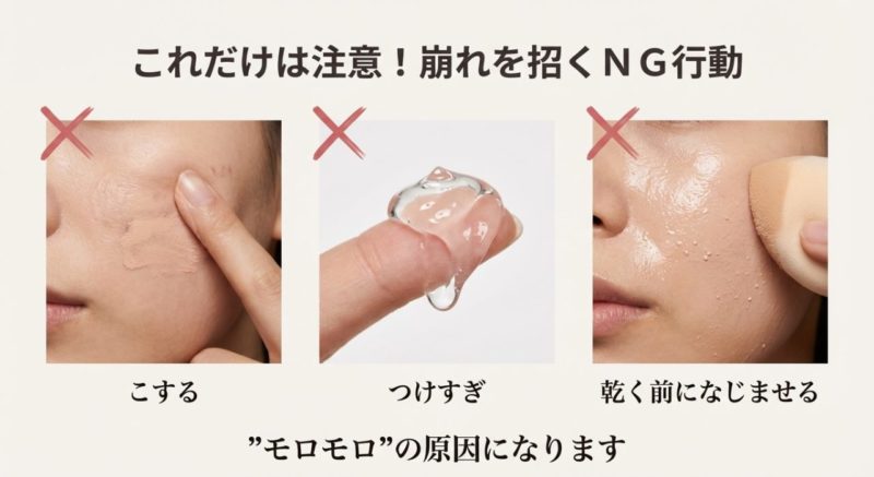 私の感覚だと、モロモロは「急いで直したい日」に出やすいです。 汗や皮脂が浮いたままジェルを重ねたり、ジェルを置いた直後にすぐファンデを重ねたり、指でグリグリ伸ばしてしまったり。 つまり、肌表面がぐちゃっとしている状態で摩擦が起きるほど、モロモロは加速します。 逆に言うと、落ち着かせればいいだけなんですよ。