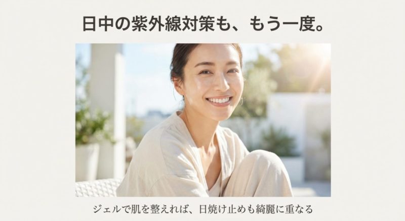 夏の外出で意外と盲点なのが、日焼け止め塗り直しです。 メイクの上から塗り直すなら、肌表面が汗や皮脂で荒れているとムラになりやすい。 ここでオールインワンジェルが“土台を整える役”として活きます。 ただし、ジェル自体にUV効果があるわけじゃないので、役割はあくまで「整えて、塗り直しを成功させる」ことです。
