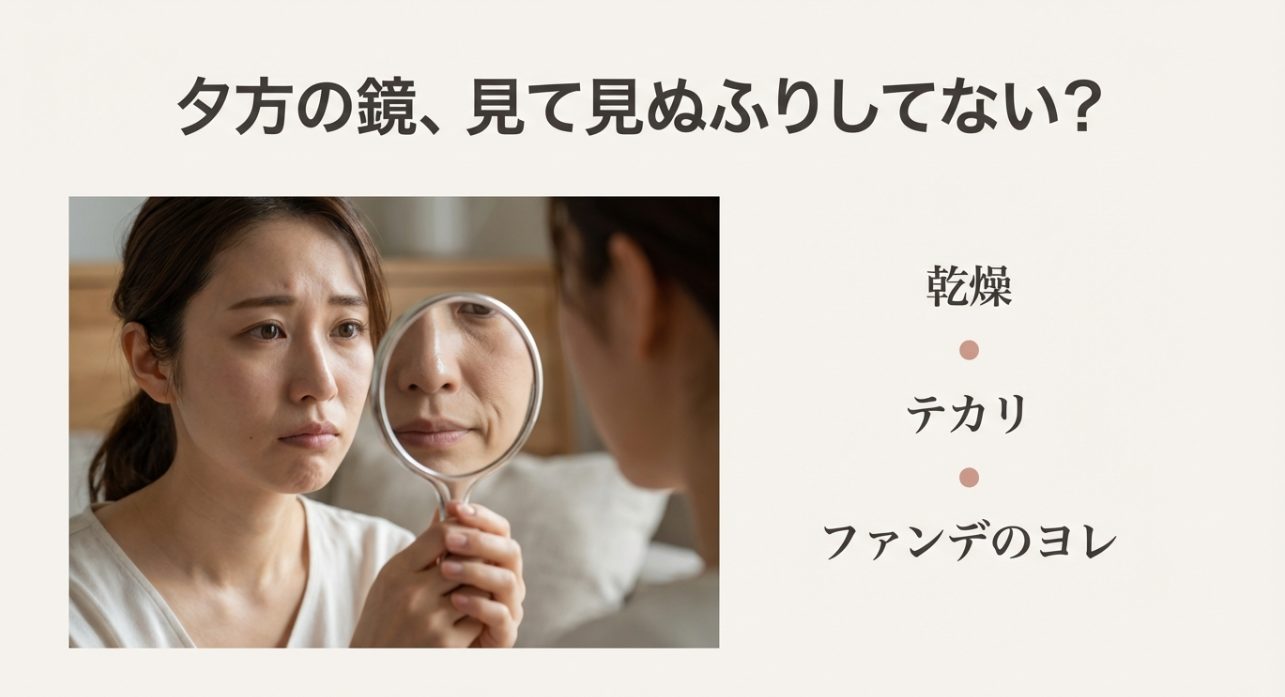 乾燥・粉吹きは、肌表面がパサついてファンデが浮く状態です。 このときは「隠す」よりも「うるおいを戻す」ほうが早いです。 特に冬のオフィスとか、エアコンが効いた室内に長くいる日って、夕方になると頬や口元がカサっとしてきません?まさにあの状態です。