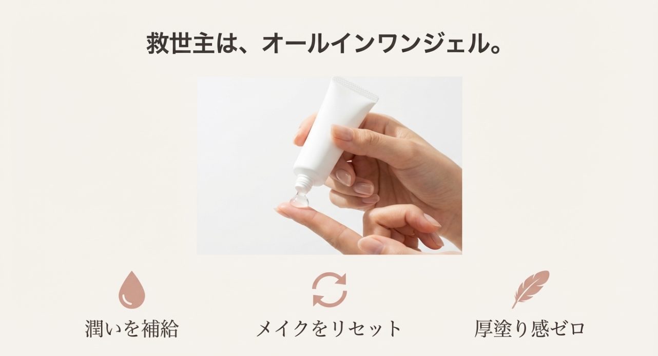 そこで使えるのが、オールインワンジェルの化粧直し。 メイクの上からでも使い方を押さえれば、うるおいを足して肌表面を整えつつ、崩れをきれいに戻せます。 逆に、やり方を間違えるとモロモロが出たり、ベタついて余計に崩れたりもするので、ここが分かれ道かなと思います。
