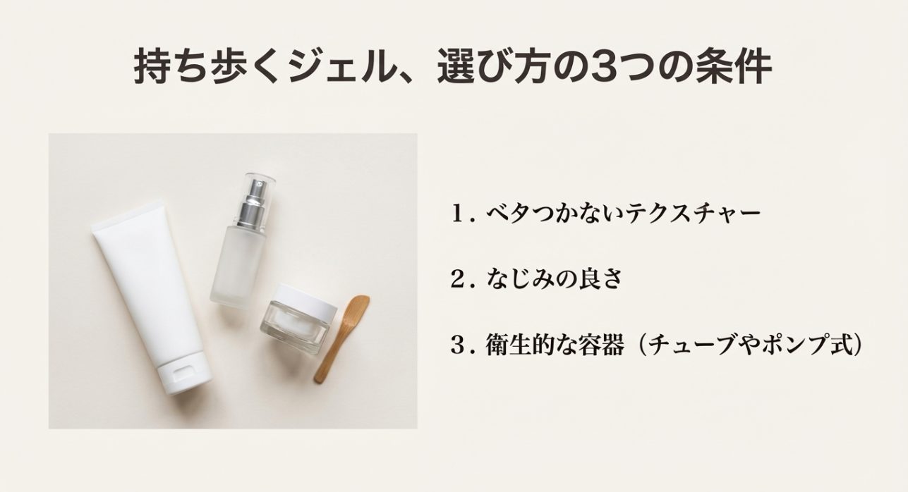 化粧直し向きのオールインワンジェルを選ぶなら、私は次の3つを軸にします。 ここを外すと「保湿はできたけど、メイクが崩れた」という本末転倒が起きやすいんですよね。 あなたも、外出先で失敗したくないはず。